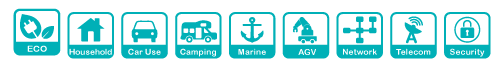家用、商用、醫療院所、交通運輸及各類工業場合...等,可驅動照明、家電、手持式工具、救難儀器、安控消防...等工業設備
