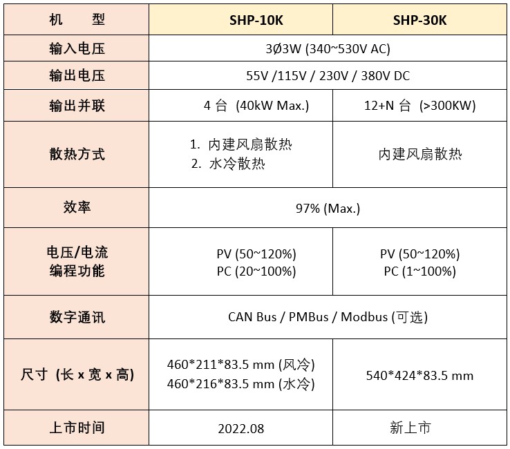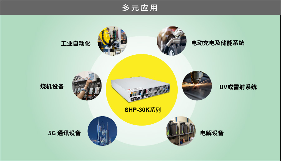 SHP-30K 系列延續之前 SHP-10K 系列,除了滿足市場客戶需求,將瓦數再向上提升,本系列具輸出并聯擴充功能,提供完整的可程序化輸出電壓 (PV) 及電流 (PC) 控制功能及內建 CAN Bus 通訊協議 (可選配 PMBus 或 Modbus 通訊協議),亦提供過負載/過溫度/過電壓等保護功能及 DC OK/風扇故障/AC 失效/過溫訊號/12VDC 輔助電源等監控訊號,讓用戶可簡單快速與終端系統設備進行自動化整合與監控。除上述特色功能,產品以綠色設計為指針,功率密度高達 26W/in3 及 97% 超高轉換效率,符合 EN/UL62368-1 信息類國際安規認證,機構為標準 19 吋 Rack 機箱 2U 高度,亦可搭配標準 19 吋機箱與機柜安裝使用,是一款適用于各種高功率工業設備的標準電源。