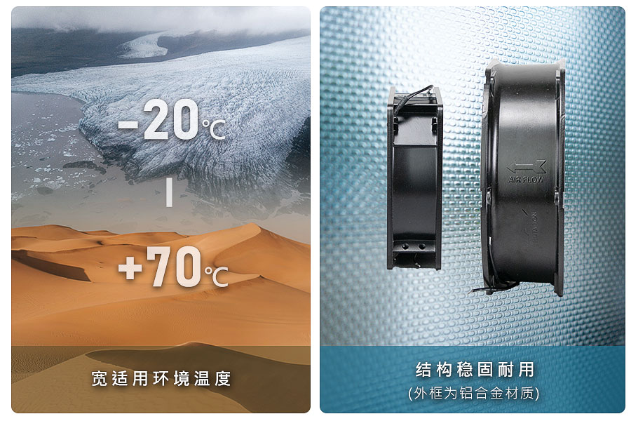PowerNex 交流散熱風扇使用滾珠軸承,通過 UL 507 認證標準,亦符合歐盟 CE 規范,且經過多項可靠度驗證,產品長時間使用安全可靠;可應用于家電、醫療、工業配電、儲能、電梯、機械設備、工具機等設備。
