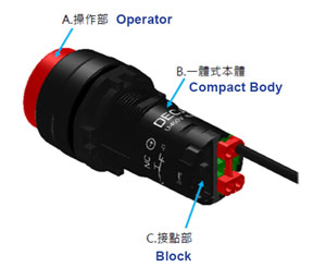 開(kāi)關(guān)型式齊全,并有16mm及22mm兩種樣式。操作部與接點(diǎn)塊一體式設(shè)計(jì), 有效縮小安裝空間。新型隔板與彈片結(jié)構(gòu)設(shè)計(jì), 增大線(xiàn)材夾持力與穩(wěn)定度。